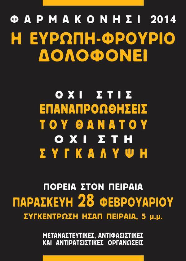 Καλούμε κάθε συλλογικότητα και κοινωνικό φορέα, κάθε ντόπιο και μετανάστη σε ένα μεγάλο Αντιρατσιστικό Συλλαλητήριο διεκδίκησης δικαιοσύνης, την Παρασκευή 28 Φλεβάρη, στις 5 μ.μ. στο σταθμό του Ηλεκτρικού στον Πειραιά. Θα ακολουθήσει πορεία στο κέντρο της πόλης με κατάληξη το Κεντρικό Λιμεναρχείο Πειραιά.