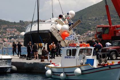 The yacht in which the tragedy occured is removed from the sea by coastguard officials on Samos (Photo: AFP)