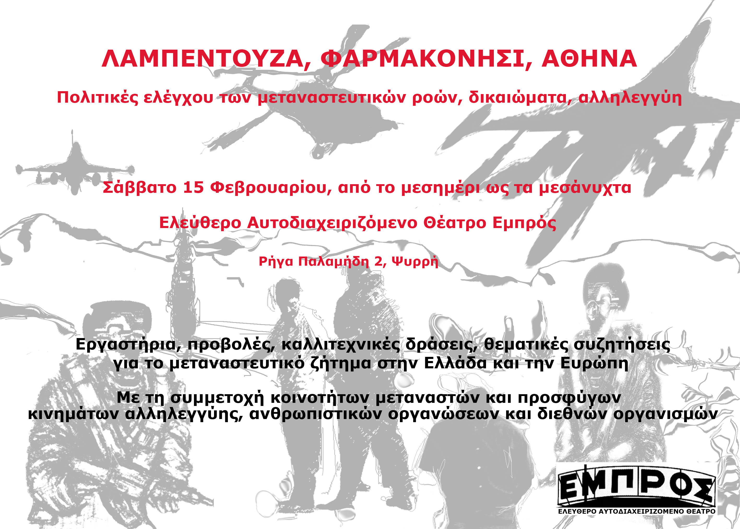 Με αφορμή τον πνιγμό 11 ανθρώπων, οκτώ παιδιών και τριών γυναικών στο Φαρμακονήσι, το Ελεύθερο Αυτοδιαχειριζόμενο Θέατρο ΕΜΠΡΟΣ (Ρήγα Παλαμήδη 2, Ψυρρή) διοργανώνει το Σάββατο, 15 Φεβρουαρίου 2014, από τις 12 το μεσημέρι ώς τα μεσάνυχτα, ημερίδα αφιερωμένη στο μεταναστευτικό ζήτημα στην Ευρώπη και την Ελλάδα.